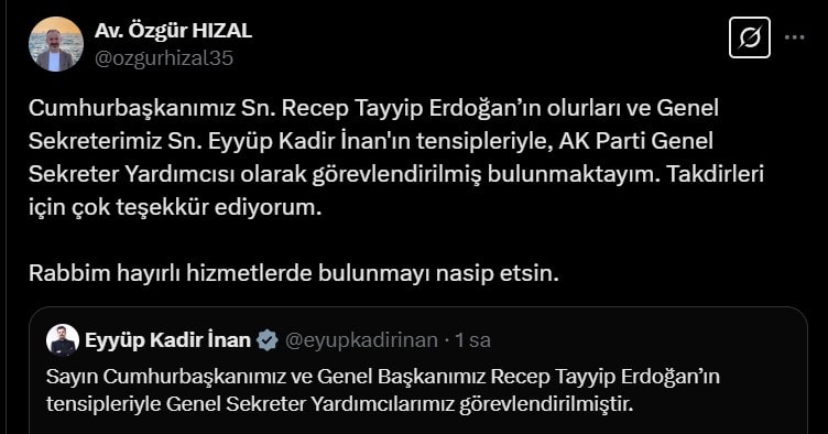 "Sayın Cumhurbaşkanımız ve Genel Başkanımız Recep Tayyip Erdoğan’ın tensipleriyle Genel Sekreter Yardımcılarımız görevlendirilmiştir." dedi.HIZAL: TAKDİRLERİ İÇİN TEŞEKKÜR EDİYORUMÖzgür Hızal da yaptığı paylaşımla, "Cumhurbaşkanımız Sn. Recep Tayyip Erdoğan’ın olurları ve Genel Sekreterimiz Sn. Eyyüp Kadir İnan'ın tensipleriyle, AK Parti Genel Sekreter Yardımcısı olarak görevlendirilmiş bulunmaktayım. Takdirleri için çok teşekkür ediyorum." dedi.