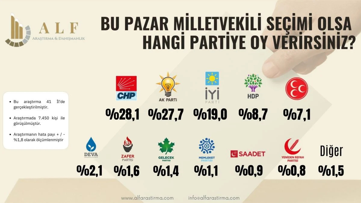 AKP'nin oy oranı yüzde 27,7 olarak ölçümlendi. İktidar partisinin oy oranının yüzde 30'un altına inmesi dikkat çekti.Öte yandan birinci parti olarak yüzde 28,1 ile CHP yer aldı. İYİ Parti'nin ise yüzde 19'a yükseldiği görüldü.