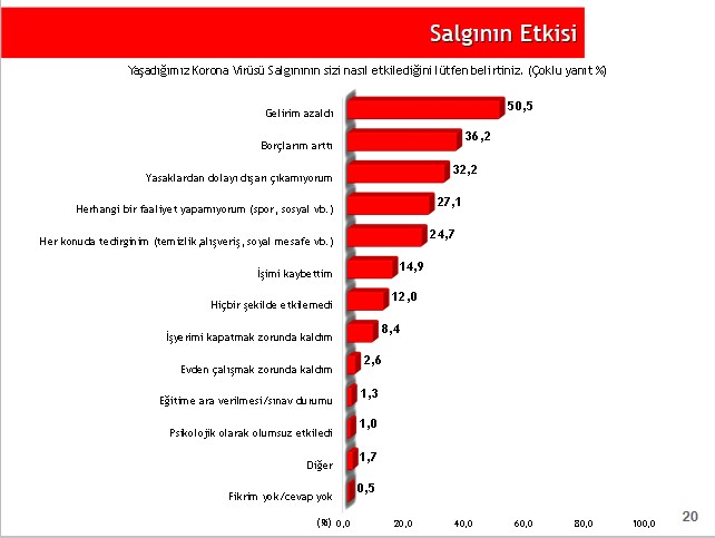 Ankete katılanlara salgından nasıl etkilendikleri sorusu yöneltildi. Katılımcıların yüzde 50,5'i "gelirim azaldı", yüzde 36,2'si "borçlarım arttı" cevabını verirken yüzde 14,9'u ise "işimi kaybettim" cevabını verdi. "Hiçbir şekilde etkilenmedim" diyenlerin oranı ise yüze 12 olarak kaydedildi.SEYAHAT YASAĞI VE 65 YAŞ ÜZERİ İÇİN SOKAĞA ÇIKMA KISITLAMASINA DESTEK