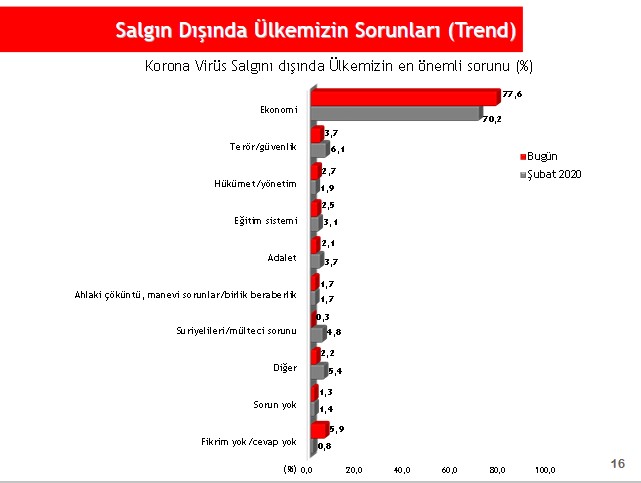 Katılımcıların yüzde 77,6'sı "Size göre Koronavirüs salgını dışında ülkemizin en önemli sorunu nedir?" sorusuna "ekonomi" yanıtını verdi. İkinci sırada yüzde 3,7 oranıyla "terör/güvenlik", üçüncü sırada yüzde 2,7 oranıyla "hükûmet/yönetim" cevabı verildi. Şubat 2020'deki araştırmada, salgın öncesinde ülkenin en önemli sorunu "ekonomi" diyenlerin oranının yüzde 70,2 olduğu belirtildi. Ayrıca Koronavirüs öncesi dönemde katılımcıların yüzde 4,8'i en önemli soruna "Suriyeliler/mülteciler" derken şu anki araştırmada bu oranın 0,3'e gerilediği bildirildi.