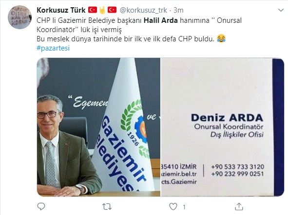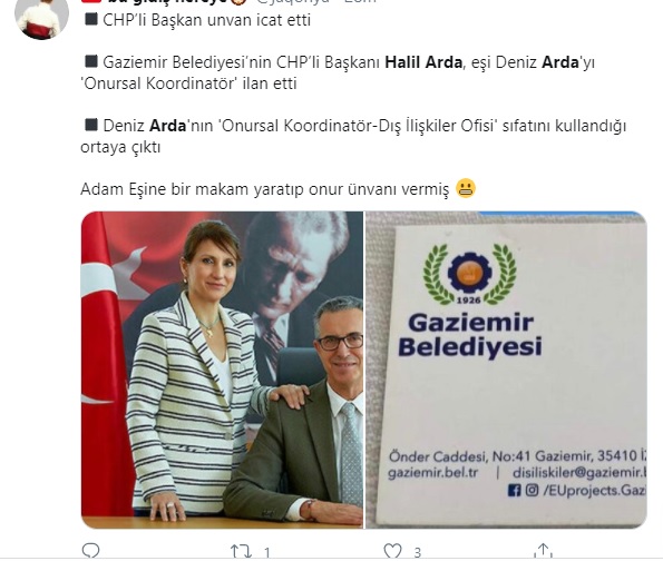 Gaziemir Belediye Başkanı Halil Arda'nın eşi Deniz Arda'nın, Gaziemir Belediyesi ismi ve logosuyla bastırdığı kartvizitte 'Onursal Koordinatör - Dış İlişkiler Ofisi' sıfatını kullandığı görüldü.