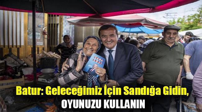 Vatandaşa sandığa gidin çağrısıVatandaşları sandığa gitmeye davet eden Başkan Batur, “Konak’ta son oy sayılana kadar sandıkların başındayız” diyerek oylara sahip çıkacaklarının garantisini verdi ve şunları söyledi:“Lütfen sandığa gidin. Vatanımız için, bayrağımız için, çocuklarımız, torunlarımız, geleceğimiz için sandığa gidin. Oyunuzu kullanın. Vatandaşlığın size verdiği bu hakkı kullanın. Bütün vatandaşlarımızı oy kullanmaya davet ediyorum. Biz sandıkta oylara sahip çıkacağız bundan kimsenin şüphesi olmasın. Önceki seçimde sabah saat tam dördü yirmi geçiyordu. Son ıslak imzalı tutanağı sisteme girdik. 768 sandığı tek tek kontrol ettik. Seçimin ilk anından sonuna kadar oradayız. Konak’ta son oy sayılana kadar sandıkların başındayız.”