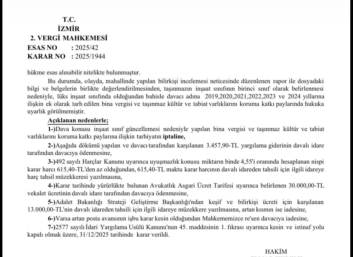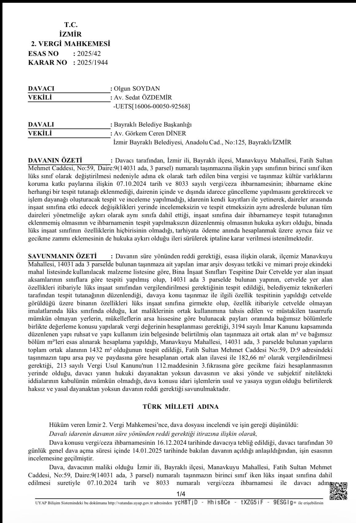 Uzun yıllardır birinci sınıf olarak vergilerini ödeyen ilçe sakinleri, konutlarının gökdelen ve rezidanslarla aynı kategoride vergilendirilmesine, geçmiş beş yılın vergilerinin konut sahiplerinden bu şekilde talep edilmesine, belediyenin kötü yönetilmesinin, kaynakların doğru kullanılmamasının bedelinin vatandaşa ödetilmesine tepki göstermişti. Bu tepkilerden biri de Bayraklı’da ikamet eden Avukat Olgun Soydan’dan geldi. Soydan söz konusu haksızlığa, ve oldu bittiye karşı konuyu yargıya taşıdı. İzmir 2. Vergi Mahkemesi bu haksızlığa adeta dur dedi ve belediyenin kurnazlıkla yaptığı inşaat sınıf güncellemesi nedeniyle yapılan bina vergisi ve taşınmaz kültür ve tabiat varlıklarını koruma katlı paylarına ilişkin tarhiyatın iptaline istinaf yolu kapalı olmak üzere karar verdi. Konuya ilişkin sosyal medya hesabından açıklama yapan Avukat Olgun Soydan şu sözleri paylaştı;"‘Toplumcu Belediyecilik’ örneği Bayraklı belediyemize dava açmak zorunda kaldım.Neden mi? 16 yıldır birinci sınıf sayılan evimi binlerce benzeri gibi kağıt üstünde lüks sınıfa çevirip geçmiş beş yıl için vergi ödetmeye çalıştığı için. Halkın sırtından milyonlarca lira kaynak yaratmanın ‘kurnaz’ yolu…Bu kaynağı ne yapacaklar derseniz;