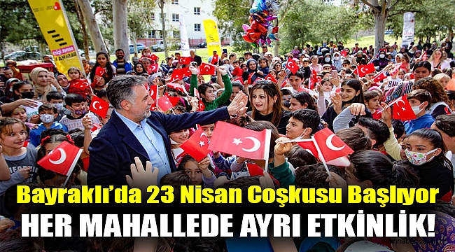 EĞLENCE SOKAKLARA TAŞACAKBayraklı’da 23 Nisan Ulusal Egemenlik ve Çocuk Bayramı, ilçenin 14 mahallesinde birbirinden eğlenceli etkinliklerle kutlanacak. İlçe sokaklarına taşacak büyük coşkuda çocuklar hafta boyunca birçok oyun ve çeşitli gösterilerle doyasıya eğlenecek. DJ Performansları, Hacivat- Karagöz Gösterileri, Spor Etkinlikleri ve Turnuvalar, Jonglör Şovları ile Sihirbaz Gösterileri çocuklara eğlence dolu anlar yaşatacak. 14 Nisan’da başlayacak olan gösteriler 23 Nisan’a kadar sürecek. 23 Nisan günü ise Bayraklı Sahil’de dev bir şenlik alanı oluşturulacak. Gün boyu konserler ve gösteriler sergilenecek. Etkinlikler boyunca çocuklara pamuk helva, patlamış mısır ve içecek dağıtılacak.