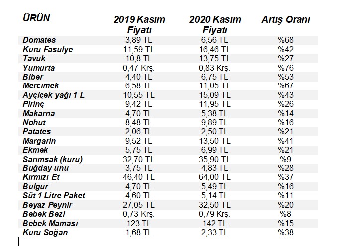 “Asgari ücret belirlenirken sadece işçinin değil, geçindirmekle yükümlü olduğu ailesinin hesaba katılması gerekirken Saray iktidarı bunun tam sürecini işletmektedir. Sendikaların, sivil toplumun ve ilgili örgütlerin talepleri göz ardı edilmiş ve ülkemizde çalışanların üçte birini ilgilendiren bir karar sosyal diyalogdan, adaletten, akıl ve vicdandan yoksun bir şekilde dayatılmıştır. Açıklanan ücret, insan haklarına, Anayasa’ya ve uluslararası sözleşmelerde yer alan Bu ücretle dakikasına üç asgari ücret harcanan Saray’da fasıllarla eğlenceler düzenleyenler, 2021 yılında işçilere, emekçilere açlığa sefalete devam’ demiştir. Saray yeni yılda işçilere ‘kuru ekmek’ hediye etmiştir. 10 milyon asgari ücretli daha fazla çalışıp daha az beslenmeye kısaca entübe olmaya devam edecektir.”CHP’li Veli Ağbaba, açıklamasında TÜİK verilerinden derlediği 2020 yılında gıda maddelerindeki artışı da paylaştı.