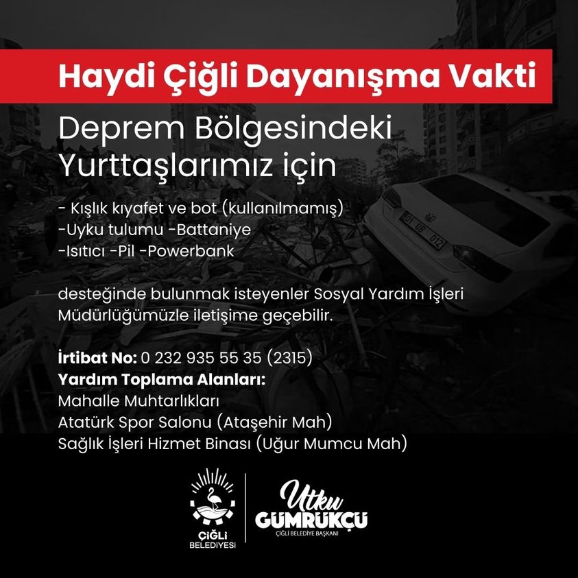 YARDIM KAMPANYASI BAŞLATILDI Öte yandan Çiğli Belediye Başkanı Utku Gümrükçü de bir yardım kampanyası duyurdu. Haydi Çiğli dayanışma vakti, denilerek duyurulan kampanya ile ilgili olarak Başkan Gümrükçü, "Deprem bölgesindeki yurttaşlarımız için kışlık kıyafet ve bot, uyku tulumu, battaniye, ısıtıcı, pil, powerbank desteğinde bulunmak isteyenlerin 0232 935 55 35 nolu telefonla irtibat kurulması istendi.