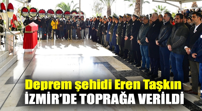 10 ili etkileyen deprem felaketinin Hatay’da askerlik yaparken yaşamdan ayırdığı İzmirli piyade er Eren Taşkın için Karşıyaka Beşikçioğlu Camii’nde tören düzenlendi. Törene şehidin annesi Dursune Taşkın ile kız kardeşi Ece Taşkın’ın yanı sıra İzmir Valisi Yavuz Selim Köşger, İzmir Büyükşehir Belediyesi Başkan Vekili Mustafa Özuslu, CHP İzmir Milletvekili Kamil Okyay Sındır, Ege Ordusu Komutanı Korgeneral Kemal Yeni, İzmir İl Emniyet Müdürü Mehmet Şahne, siyasi parti temsilcileri, yurttaşlar ve şehidin yakınları katıldı. Eren Taşkın’ın cenazesi Kadifekale Şehitliği’ne defnedildi.