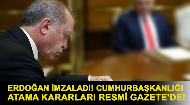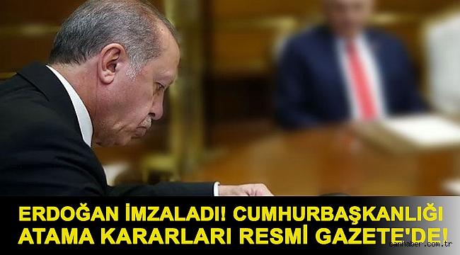 Resmi Gazete'nin bugünkü sayısında AKP Genel Başkanı ve Cumhurbaşkanı Recep Tayyip Erdoğan'ın imzasıyla yayımlanan atama kararlarına göre, Strateji ve Bütçe Başkanlığı I'nci Hukuk Müşavirliğine Sinan Taş, Aile ve Sosyal Hizmetler Bakan Yardımcılığına Doç. Dr. Kübra Güran Yiğitbaşı atandı.Çevre ve Şehircilik Bakanlığı Mesleki Hizmetler Genel Müdür Yardımcılığına Fuat Uzun getirilirken; Çevre ve Şehircilik Bakanlığı Başmüfettişliklerine Alaettin Kandemir, Onur Şatıroğlu, Onur Özavcı, Ahmet Çelikdin, Sebiha Çetin, Özgür Kabayel, Ferhat Aydın, Burcu Gündoğdu, Hakan Özmen, Sevda Soysal, Cemal Alpaslan Özcan, Göksel Yolcu, Yusuf Kenan Karaaslan, İbrahim Yılmaz, Ertan Örs ve Adnan Doğan getirildi.Tabu ve Kadastro Genel Müdürlüğü VI'ncı Bölge Müdürlüğüne Funda Aydın Seymen, XXI'inci Bölge Müdürlüğüne Hamdi Erşen atandı.
