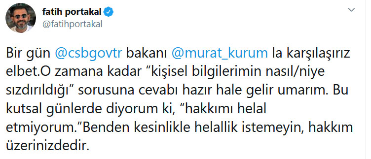 FOX TV Ana Haber Sunucusu Fatih Portakal, Çevre ve Şehircilik Bakanı Murat Kurum’a seslenerek, kişisel verilerinin neden bazı gazetelere sızdırıldığını sormuştu. Sorusuna yanıt alamayan Portakal dün CİMER'e başvurdu.Fatih Portakal, bugün sosyal medyada yeni bir açıklama yaparak Çevre ve Şehircilik Bakanı Murat Kurum’a hakkını helal etmediğini ifade etti.Fatih Portakal şunları yazdı:“Bir gün @csbgovtr bakanı @murat_kurum la karşılaşırız elbet. O zamana kadar ‘kişisel bilgilerimin nasıl/niye sızdırıldığı’ sorusuna cevabı hazır hale gelir umarım. Bu kutsal günlerde diyorum ki, ‘hakkımı helal etmiyorum.’ Benden kesinlikle helallik istemeyin, hakkım üzerinizdedir.”