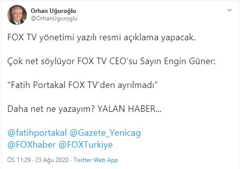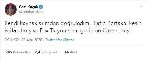 Ancak AKP yandaşı iki isim ise iddianın doğu olduğunu savundu.Türkiye gazetesi yazarı Cem Küçük, kişisel Twitter hesabından yaptığı paylaşımda, “Kendi kaynaklarımdan doğruladım. Fatih Portakal kesin istifa etmiş ve Fox Tv yönetimi geri döndürememiş” dedi.