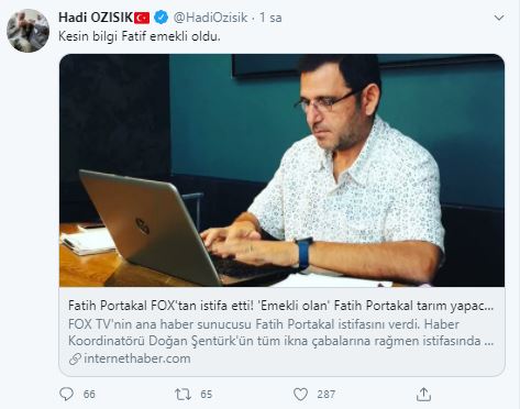 İnternethaber Yayın Grubu Yönetim Kurulu Başkanı Hadi Özışık da, ilgili haberi, "Kesin bilgi Fatih emekli oldu" notuyla sosyal medya hesabından paylaştı.