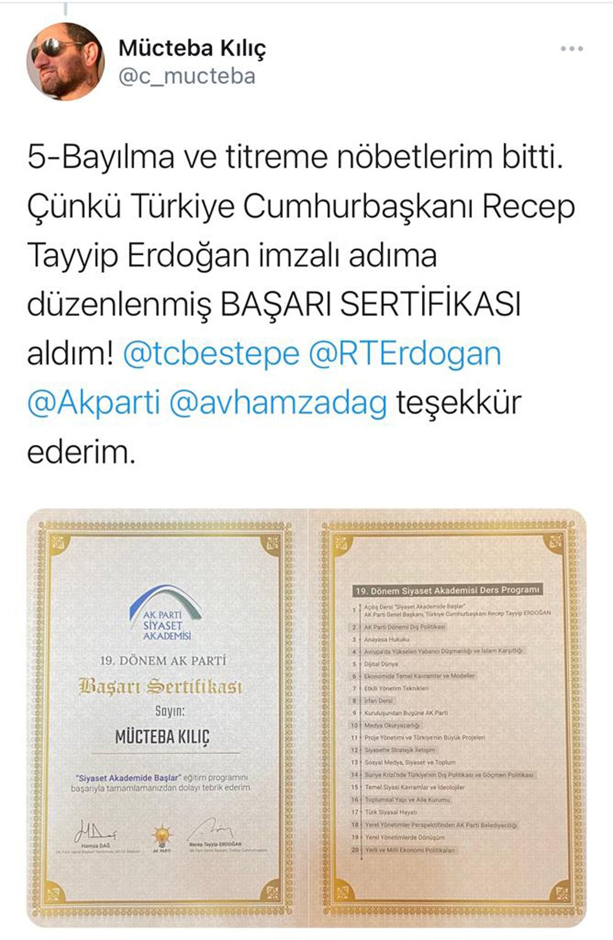 Sözcü'den Veli Toprak'ın haberine göre; Devrimci Sosyalist İşçi Partisi'nin (DSİP) üyesi olan Mücteba Kılıç, 2016'da FETÖ operasyonu kapsamında tutuklandı. FETÖ üyeliğinden 26 ay hapis yattı. Yargılandığı davada etkin pişmanlıktan yararlanarak itirafçı oldu. 100'den fazla örgüt mensubunun ismini veren Kılıç tahliye edildi. AKP'nin yeni siyasetçi yetiştirmek için açtığı Siyaset Akademisi'ne mücteba kılıç da başvurdu. Müracaatı kabul edilen Kılıç, pandemi nedeniyle uzaktan ders aldı. Dersleri başarıyla verdiği için sertifika almaya hak kazandı.