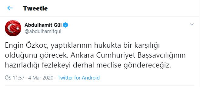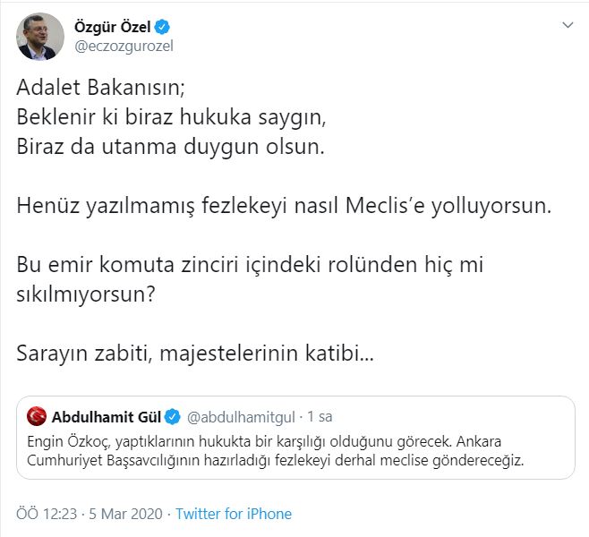 Meclis'te AKP ve CHP'li vekiller arasında çıkan kavgadan sonra hakkında soruşturma başlatılan CHP'li Engin Özkoç için Twitter üzerinden, "Fezlekeyi derhal meclise göndereceğiz." diyen Adalet Bakanı Abdulhamit Gül'e CHP'li Özgür Özel'den yanıt gecikmedi.Özel, kendi twitter hesabından, Adalet Bakanı Abdulhamit Gül'e; "Adalet Bakanısın; Beklenir ki biraz hukuka saygın, Biraz da utanma duygun olsun. Henüz yazılmamış fezlekeyi nasıl Meclis’e yolluyorsun. Bu emir komuta zinciri içindeki rolünden hiç mi sıkılmıyorsun? Sarayın zabiti, majestelerinin katibi..." yazdı.