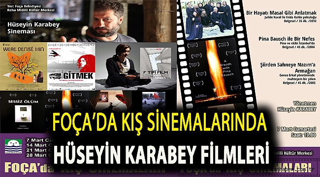 7 Mart Cumartesi günü Saat 19.00’da Foça Belediyesi Reha Midilli Kültür Merkezi’nde ‘‘Şiirden Sahneye Nazım’a Armağan’’, ‘‘Bir Hayatı Masal Gibi Anlatmak’’ ve ‘‘Pina Bausch ile Bir Nefes’’ filmlerinin gösterimleri yapılacak.