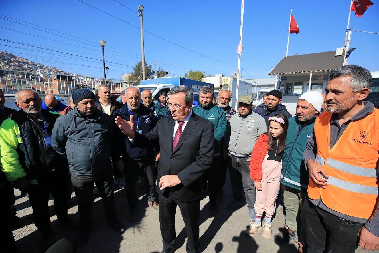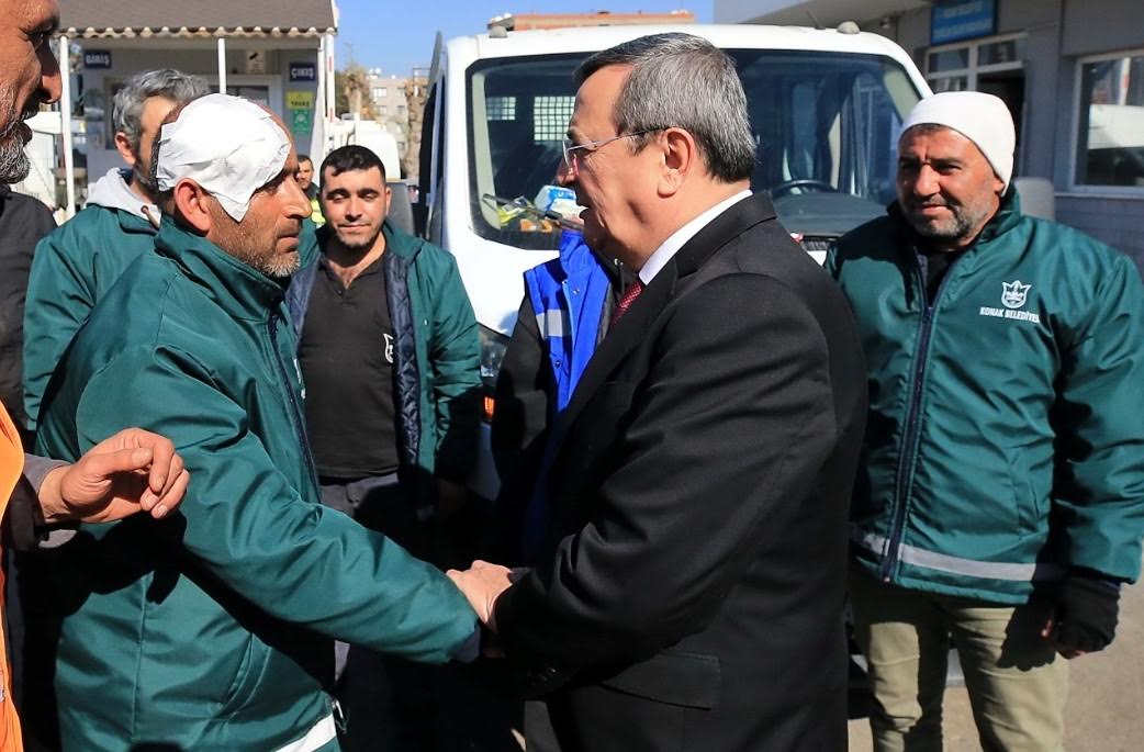 Konak Belediye Başkanı Abdül Batur, Kahramanmaraş merkezli depremlerin yarattığı büyük yıkımın ardından bölgeye giderek arama, kurtarma ve destek çalışmalarına katılan, görevlerini tamamladıktan sonra İzmir’e dönen Konak Belediyesi ekiplerini karşıladı. Belediyenin temizlik işleri şantiyesinde kahraman ekiple bir araya gelen Başkan Batur, Hatay’da üstlendikleri görevleri başarıyla yerine getiren ekip üyelerine teşekkürlerini iletti. En son yaşanan ve art arda meydana gelen Hatay merkezli depremlerde, yıkılan duvar sebebiyle yaralanan ekip üyelerine de ‘geçmiş olsun’ dedi. Başkan Batur, “Gece gündüz durmadan çalıştılar ve orada Konak Belediyemizin çalışmalarını en iyi şekilde yürüttüler. Allah bir daha böyle afet yaşatmasın. Hatay merkezli depremlere de arkadaşlarımız yemek sırasında yakalandılar. Maalesef duvarın yıkılmasıyla yaralandılar. Yaralanma pahasına orada en iyi şekilde hizmet etmeye çalıştılar” diye konuştu.