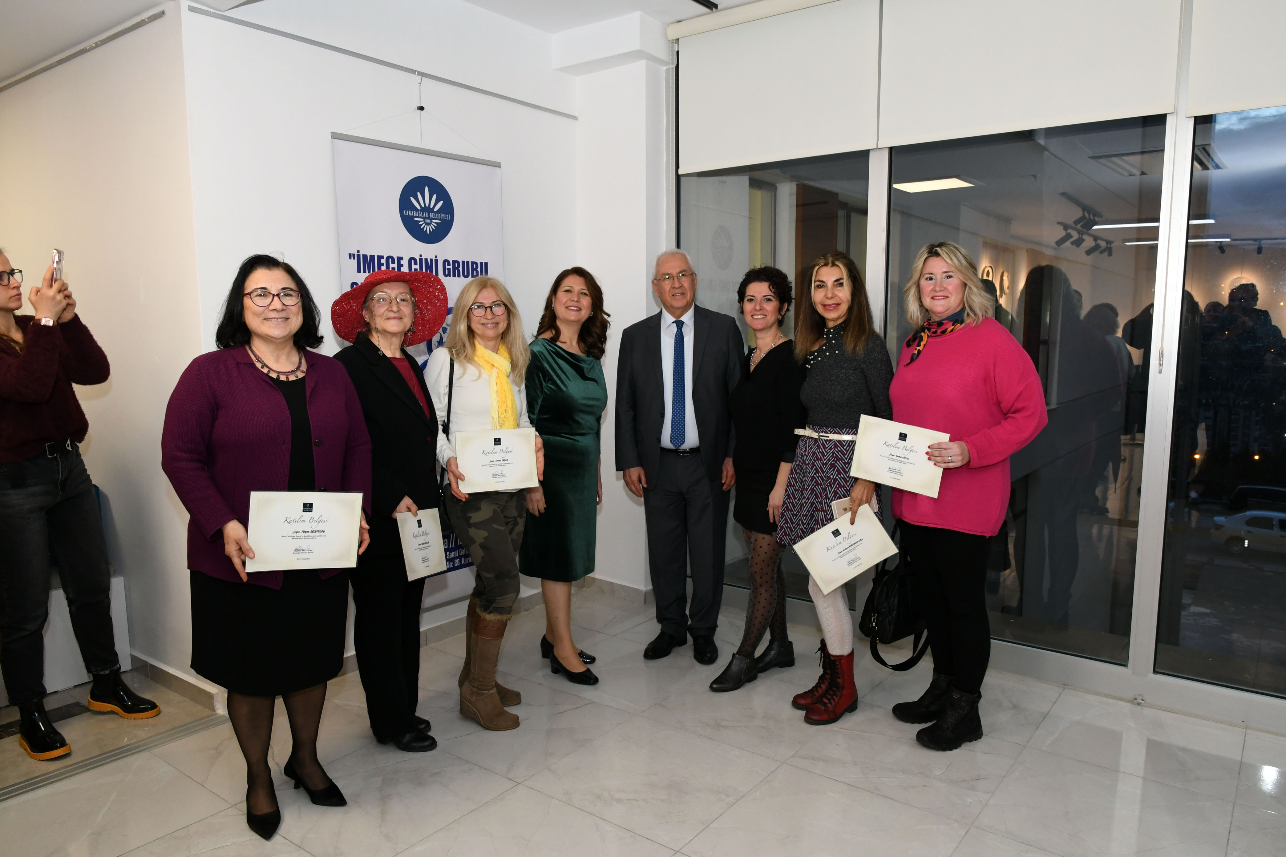 Törene, Karabağlar Belediye Başkanı Muhittin Selvitopu, aynı zamanda sergide eserleri yer alan eşi Fügen Selvitopu, Karabağlar Kent Konseyi Başkanı Alev Ağrı, CHP İlçe Kadın Kolları Başkanı Aydan Tör, meclis üyeleri, muhtarlar, siyasi parti ve sivil toplum kuruluşlarının temsilcileri, çini sanatçıları ve sanatseverler katıldı.Başkan Selvitopu törende yaptığı konuşmada, sergiye katkı sunan ve emeği geçen herkese teşekkür ederek, “Hatay Caddesi'nde küçük bir yerimiz vardı. Belediye şirketimiz burayı boşaltınca, Sosyal Yardım İşleri Müdürlüğümüzün önerisiyle çini kursu açtık. Gönüllü kursiyerlerimiz burada Nesrin Dikmen hocamızdan eğitim aldılar. Bugün sergi açacak noktaya gelmeleri bizleri çok mutlu etti” dedi.