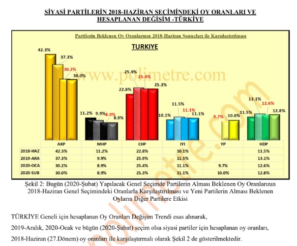 Bugün (2020-Şubat), 2018-Haziran Genel Seçim sonuçlarına göre AKP ve MHP oylarında azalma, diğer partilerin oylarında artış hesaplanmaktadır. • Bugün (2020-Şubat) Genel Seçim olsa, AKP oy oranı %30.0 olmakla birlikte hala birinci partidir.