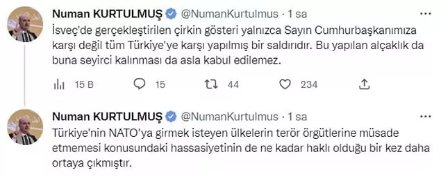 Skandal görüntülerin ardından bir tepki de İletişim Başkanı Fahrettin Altun'dan geldi.Altun, 'İsveç'te terör örgütü PKK'nın üyeleri tarafından Türkiye'nin ve demokratik olarak seçilmiş cumhurbaşkanının hedef alınmasını en güçlü şekilde kınıyoruz. İsveç makamlarını daha fazla gecikmeden terör örgütlerine karşı gerekli adımları atmaya çağırıyoruz. İsveç'in, Türkiye'nin 70 yıldır üyesi olduğu NATO'ya katılmak için Madrid'de verdiği sözleri tutması gerekiyor. Türkiye'nin bu konuda taviz vermesini beklemek abes olur. PKK'lı teröristin Stockholm'ün göbeğinde İsveç hükümetine kafa tutabilmesi, İsveç makamlarının son günlerde iddia ettikleri gibi teröre karşı gerekli adımları atmadıklarının kanıtıdır.' ifadelerini kullandı.