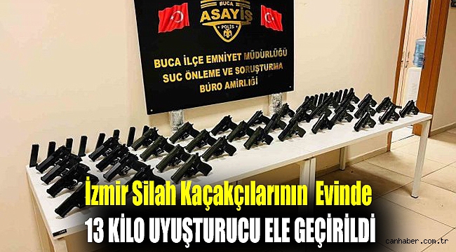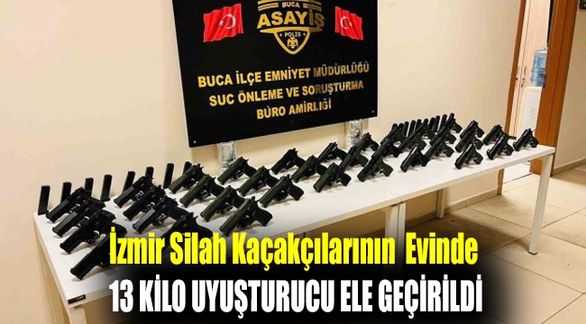İzmir’in Buca ilçesinde silah kaçakçılığı yaptığı belirlenen şüphelilerin evine operasyon gerçekleştiren polis ekipleri, çok sayıda ruhsatsız tabancanın yanı sıra 13 kilogram uyuşturucu maddesi ele geçirdi.