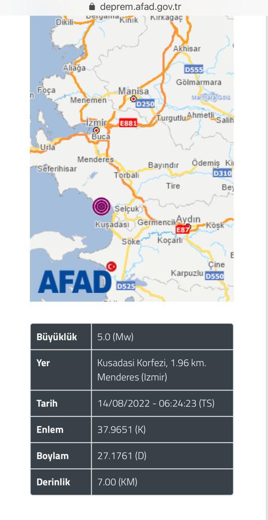Afet ve Acil Durum Yönetimi Başkanlığı (AFAD) verilerine göre, Ege Denizi Kuşadası Körfezi'nde bugün saat 06.24'te merkez üssü Menderes açıklarında 5.0 büyüklüğünde deprem meydana geldi.