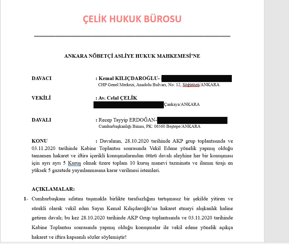"Cumhurbaşkanı sıfatını taşımakla birlikte tarafsızlığını tartışmasız bir şekilde yitiren ve sürekli olarak vekil eden Sayın Kemal Kılıçdaroğlu’na hakaret etmeyi alışkanlık haline getiren davalı; bu kez 28.10.2020 tarihinde AKP Grup toplantısında ve 03.11.2020 tarihinde Kabine Toplantısı sonrasında yapmış olduğu konuşmalar ile vekil edene yönelik açıkça hakaret ve iftira kapsamlı sözler söylemiştir!HAKARET VE İFTİRA KAPSAMLI SÖZLER SARF ETTİ