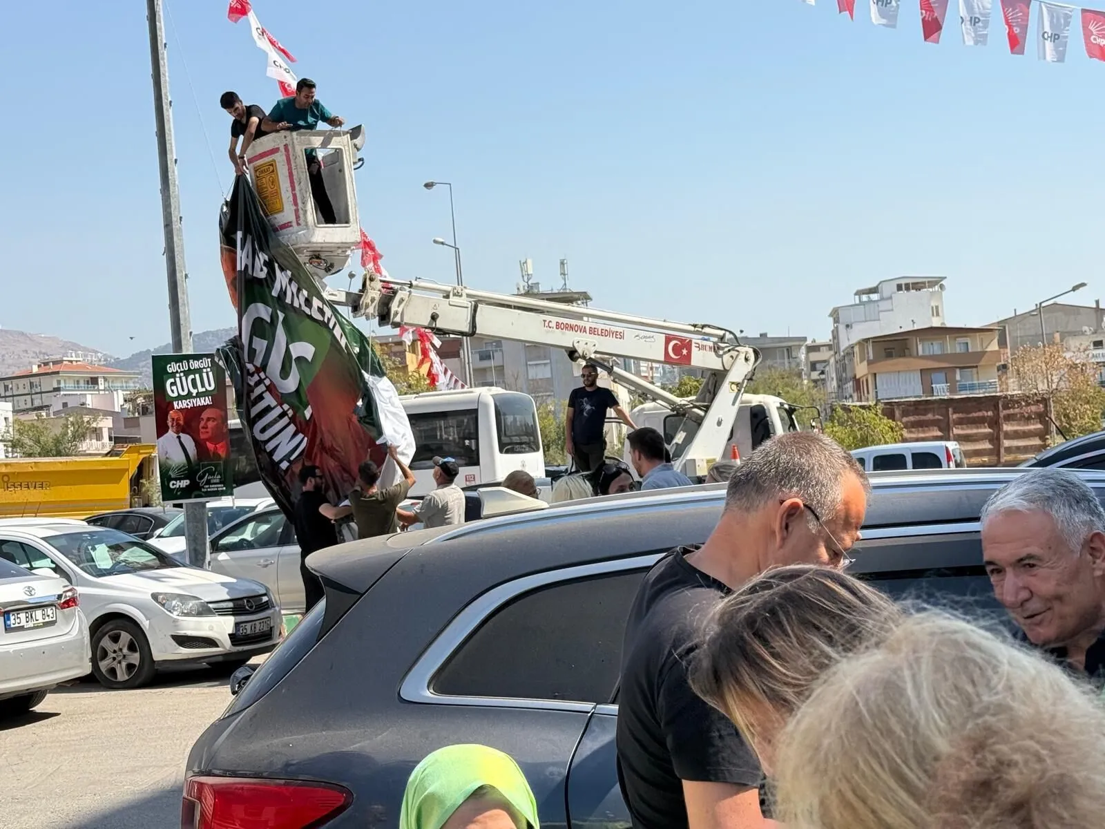 BORNOVA’DAN VİNÇ DESTEĞİMevcut İlçe Başkanı Levent Güçlü’ye Bornova Belediye Başkanı Ömer Eşki’den vinç desteği geldi. Karşıyaka’da başlayan iş durdurma sebebiyle Karşıyaka Belediyesi’ne ait araçların çıkarılamadığı öğrenilirken, kongre salonuna Güçlü’nün pankartlarını asmak için Bornova Belediyesi’nin vincinin getirildiği görüldü.
