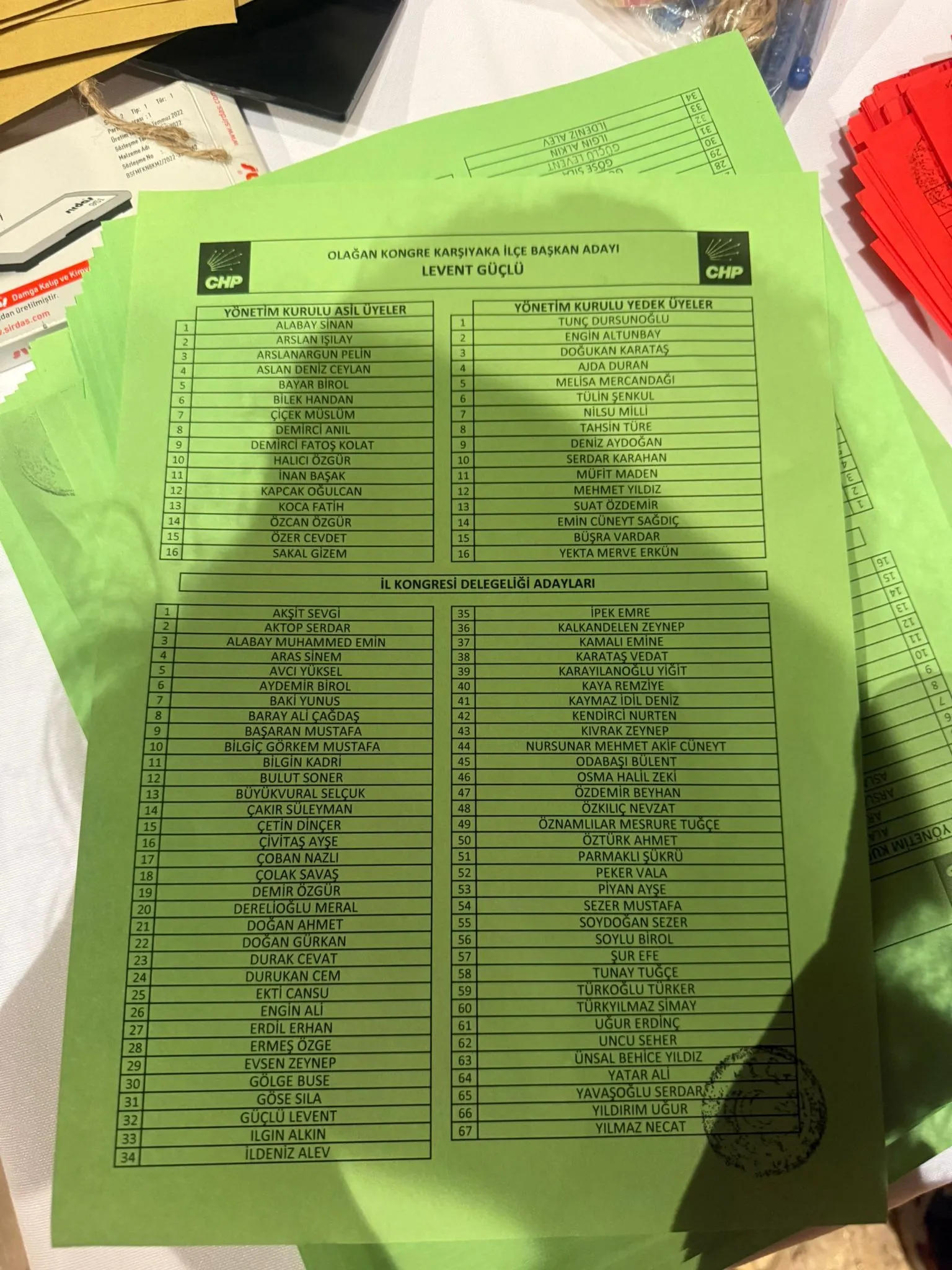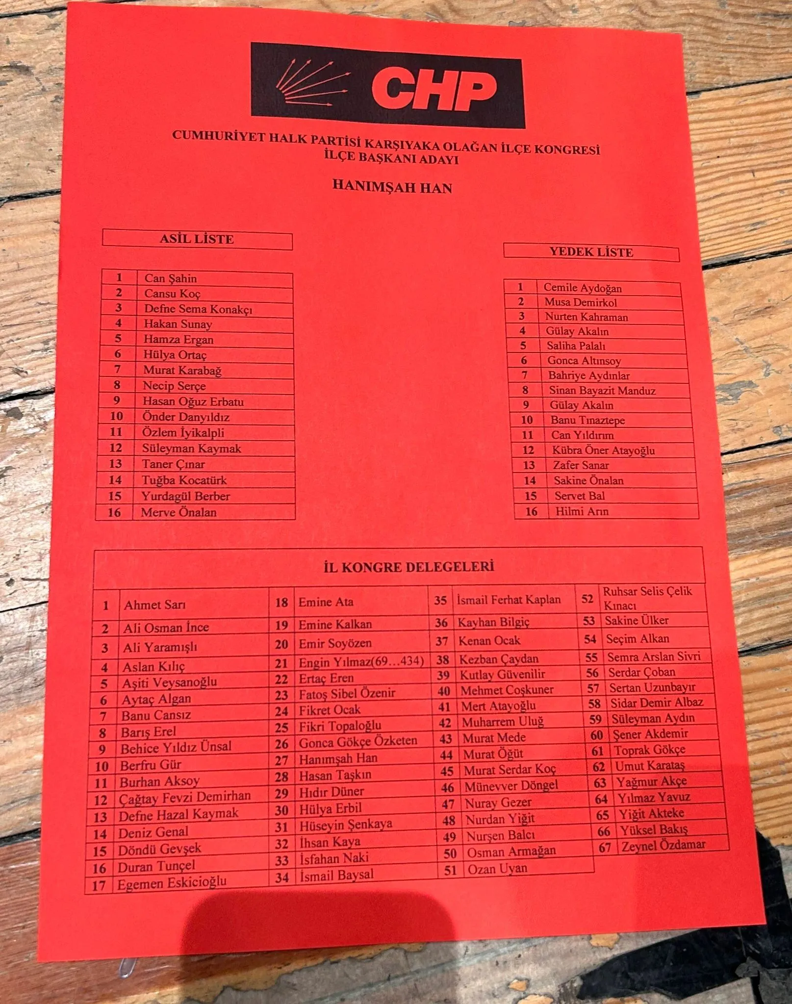 BAŞKANLARA 'MÜDAHALE' TEPKİSİEski İl Disiplin Kurulu Başkanı Birol Soylu, Levent Güçlü'ye desteğini açıkladı. Kongrede yaptığı konuşmasında belediye başkanlarının örgüte karıştığını dile getirerek, “Büyükşehir Belediye başkanımız karışmayacağım dedi ama görüyoruz. Bu örgütü rahat bırakın. Hiçbir belediye başkanı örgütü yönetmeye kalkmasın” dedi.GENÇLİKTEN HAN'A DESTEKCHP İzmir Gençlik Kolları Başkanı Ruhsar Selis Çelik ise kürsüde Hanımşah Han'ı desteklediğini açıkladı.CHP İzmir eski İl yöneticisi Şener Akdemir, "Cumhuriyet kadındır, cumhuriyet kırmızıdır. Kadınlar hala çile çekiyor. Kadın bir cins kırım haline geldi. Kadın cinayetleriyle, kadınlara yönelik ayrımcılıkla kadınlar mücadele etsin" sözleriyle Hanımşah Han'a desteğini açıkladı.Eski İl Gençlik Kolları Başkanı Ozan Uyan’ın konuşması sırasında partililerin tepki gösterdiği, ‘sen bir yere aday mısın? Bu kadar konuşma yapıyorsun’ dediği görüldü.LİSTELER BELLİ OLDU