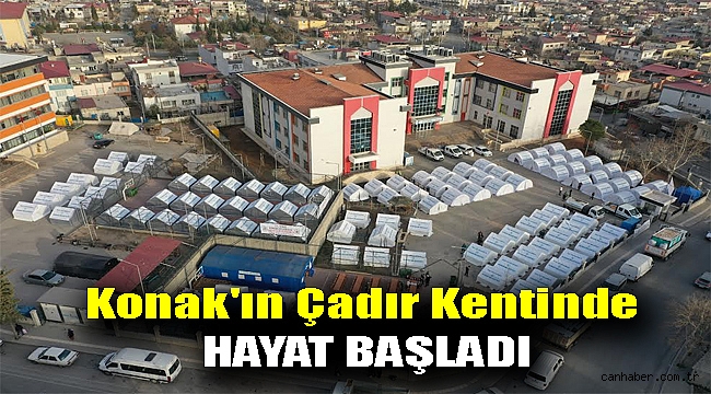 İki mobil mutfakla üç öğün yemek Okulun spor sahasını, iki mobil mutfağın bulunduğu bir yemekhaneye dönüştüren konak Belediyesi, çadır kentte kalan vatandaşlara sabah, öğle ve akşam olmak üzere üç öğün yemek servisi yapıyor. Konak Belediyesi’nin çadır kentinde çocuklar için özel bir alan da oluşturuldu. Kurulan mavi çadırda çocuklar için eğlenceli ve eğitici aktiviteler düzenleniyor. Aileler okulun içinde bulunan ve dönüştürülerek daha kullanışlı hale getirilen duş ve tuvaletleri kullanıyor. Çadır kentin bakım ve temizliği de Konak Belediyesi ekipleri tarafından yapılıyor.