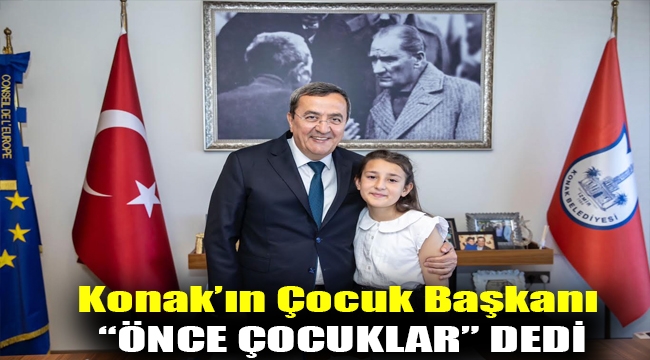 Konak Belediye Başkanı Abdül Batur, 23 Nisan Ulusal Egemenlik ve Çocuk Bayramı kutlamaları çerçevesinde bu yıl koltuğunu Mersinli İlkokulu 4-A sınıfı öğrencisi Mira Aslan’a devretti. Başkan Batur’un makam odasında karşıladığı Mira Aslan’a Mersinli ilkokulu Müdürü Emine Ahu Ünlü, sınıf öğretmeni Anı Özsoy, annesi Gülşen Aslan ve babası Engin Aslan eşlik etti. Çocuk başkanın talimatlarını yerine getirmek üzere Konak Belediyesi bürokratları da makamda hazır bulundu.