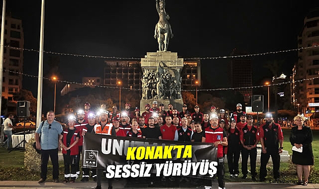 Konak Belediyesi’nin 17 Ağustos Marmara Depremi anısına düzenlediği “Sessiz Yürüyüş” ilçe belediyelerin arama kurtarma ekiplerinin katılımıyla gerçekleşti. Konak Belediyesi Afet Merkezi Arama Kurtarma Timi’yle (KAM) birlikte İzmir Büyükşehir Afet Koordinasyon Merkezi (AKOM), Balçova Belediyesi Arama Kurtarma Timi (BALKUT), Karşıyaka Belediyesi Arama Kurtarma Ekibi, Menderes Belediyesi Arama Kurtarma Ekibi (MAK), Foça Belediyesi Afet İşleri Müdürlüğü ve Karabağlar Belediyesi Arama Kurtarma ekibi Gündoğdu Meydanı’ndan Cumhuriyet Meydanı’na yürüdü. Kortejin önünde “Unutmayacağız” pankartı yer alırken yürüyüş boyunca sessiz kalınarak farkındalık yaratıldı. Ellerinde Atatürk posteri ve Türk bayrağı taşıyarak Cumhuriyet Meydanı’nda Atatürk anıtının önünde toplanan ekipler, burada İzmir Afet Bilinci, Çevre ve İklim Farkındalığı Derneği (İZ-AFED) Başkanı Servet Ertaş’ın arama kurtarma ekipleri için yazdığı şiirle karşılandı. Arama kurtarma ekipleri, saygı duruşu ve İstiklal Marşı’nı okunmasının ardından, enkaz arama kurtarma çalışmalarında yürekleri dağlayan ama bir o kadar da hayata bağlayan “Sesimi Duyan Var mı?” diye bağırarak sessiz yürüyüşü sonlandırdı. Tüm ekipler adına, ev sahibi Konak Belediyesi’nin Afet İşleri Müdürü ve KAM Ekip Lideri Şebnem Firdevs Karakaya bir konuşma gerçekleştirerek şu ifadeleri kullandı:“45 saniyede binlerce canımızı yitirdiğimiz, milyonlarca hayatın değiştiği o kara geceyi anarken, sadece yas tutmakla kalmıyoruz. Aynı zamanda ders alıyor, dayanışmayı büyütüyor ve dirençli bir gelecek için söz veriyoruz.”