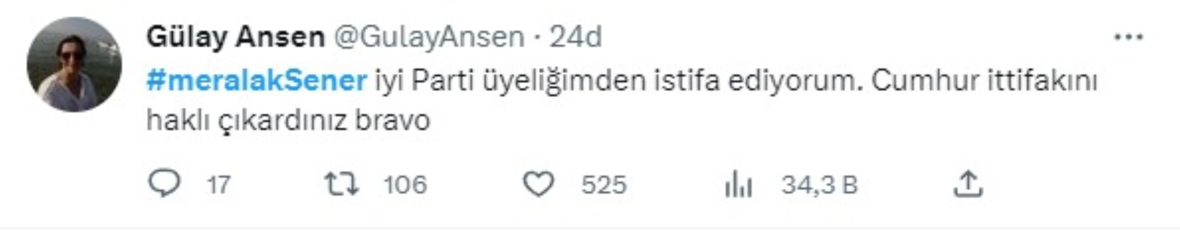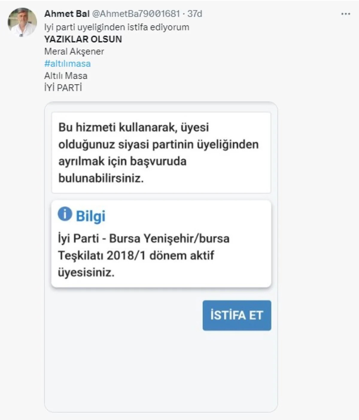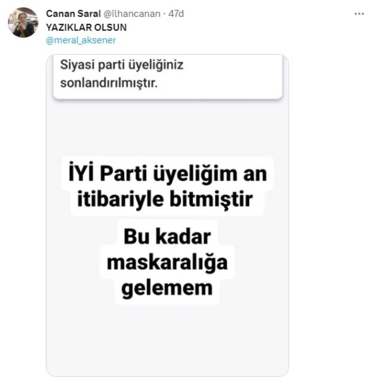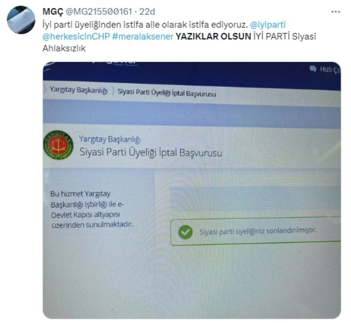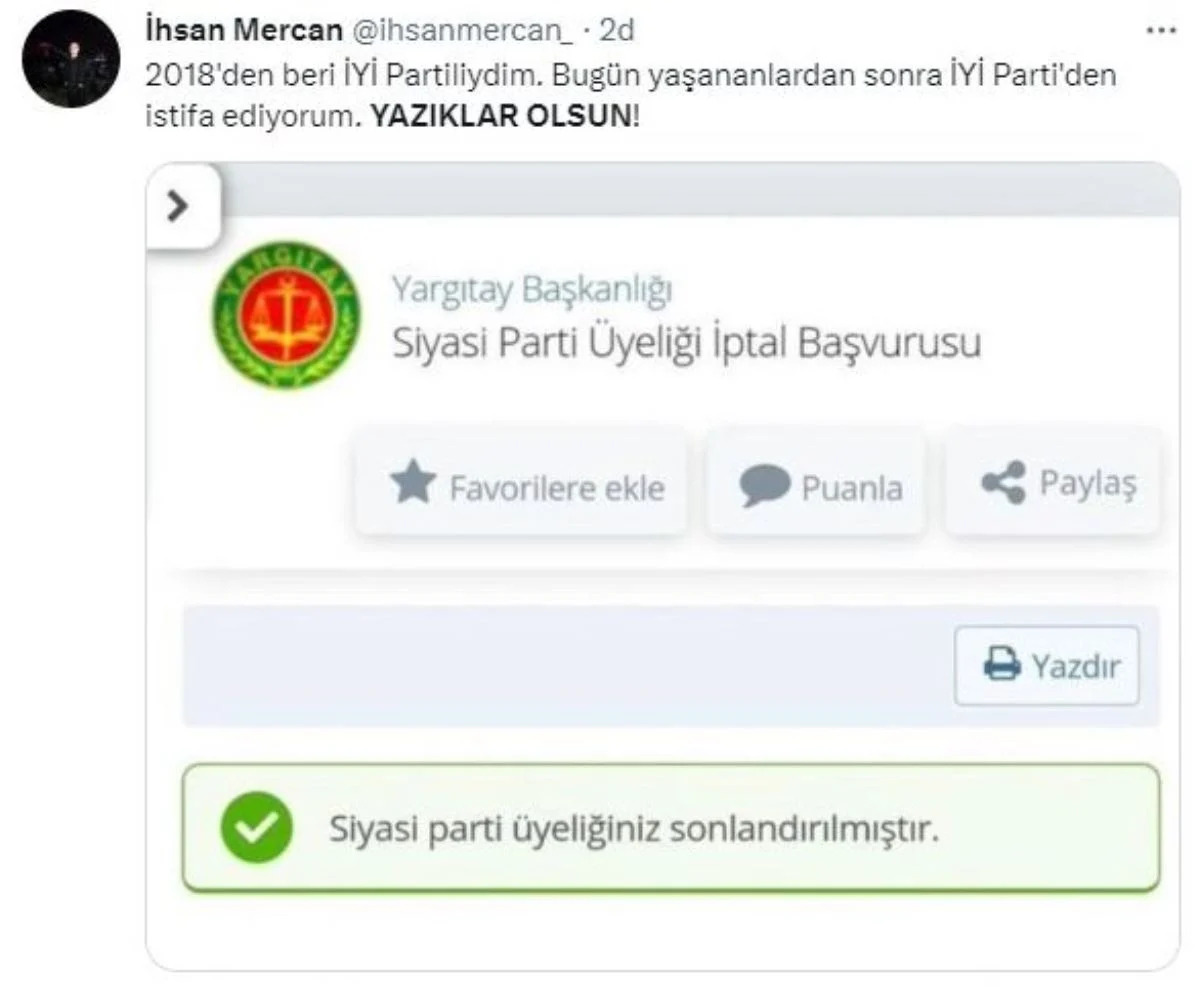 Millet İttifakı’nın toplantısının ardından cumhurbaşkanı adayı konusunda partisiyle istişare etmek üzere partisinin Genel İdare Kurulu (GİK) ile bir araya gelen İYİ Parti Genel Başkanı Meral Akşener, CHP Genel Başkanı Kemal Kılıçdaroğlu'nun cumhurbaşkanı adaylığına 'ret oyu' verdiklerini açıkladı.Akşeneri'in açıklamalarının ardından sosyal medyada binlerce tepki paylaşımı yapıldı."Yazıklar Olsun" etiketi ile yapılan paylaşımlarda, bazı İYİ Partili kullanıcılar parti üyeliğinden istifa ettiklerine ilişkin görseller paylaşarak tepkilerini dile getirdi.İstifa ve tepkilerin yer aldığı sosyal medya paylaşımlarından bazıları şöyle:
