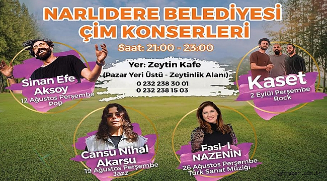 Narlıdere Belediyesi’nin bu yıl ilk kez düzenleyeceği Çim Konserleri, pazar yerinin üst kısmındaki zeytinlik alanda yeni yapılan Zeytin Kafe’nin bahçe alanında 21.00- 23.00 saatleri arasında yapılacak. İlk konser 12 Ağustos Perşembe günü gerçekleşecek ve pop müziğin sevilen ismi Sinan Efe Aksoy sahne alacak.