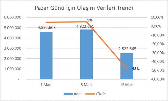 Çin'in Wuhan kentinde ortaya çıkan ve hızla dünyaya yayılarak binlerce insanın ölümüne neden olan corona virüsüne karşı yetkililer ve vatandaşlar önlem almaya devam ediyor. Yetkililer sık sık kalabalık yerlerden uzak durulması gerektiği yönünde uyarı yaparken vatandaşlar da evlerinde kalmayı tercih ediyor.Bu durum pazar günü İstanbul’da toplu taşıma kullanımına da yansıdı. İBB yetkililerinden yapılan açıklamada İstanbul’da toplu taşıma kullanımının pazar günü (15 Mart) bir önceki pazara göre (8 Mart) yüzde 48 oranında azaldığı görüldü.