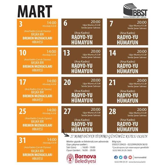 Bornova Belediyesi Uğur Mumcu Kültür ve Sanat Merkezi Sevda Şener Sahnesi’nde promiyeri yapılan oyun, büyük beğeni topladı. BBŞT oyuncuları Özlem Lale’nin yazıp, Hakan Taner Yıldırım’ın yönettiği komedide sergiledikleri performansla yine büyük beğeni topladı. Salonu dolduran tiyatroseverler tüm ekibi, dakikalarca ayakta alkışladı. “Yok artık!” dedirten olaylar zinciri1900’lü yılların başında İstanbul’da babalarından kalma eski bir konakta küçücük hayatlarına sıkışmış bir aileyi anlatan oyun, Avrupa’da yeni icat edilmiş radyonun hayatlarına girmesiyle yaşanan ilginç olayları anlatıyor. Aşk, entrika ve şantajlarla dolu Radyo-yu Hümayun, tekmili birden yok artık dedirtecek bir komedi.