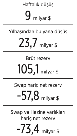 Seçim öncesinde hükümet, döviz kurlarındaki artışı frenlemek ve ekonomiyi canlı tutmak için MB rezervlerini seferber etti. MB’nin brüt rezervi 6-12 Mayıs haftasında bir önceki haftaya göre 9 milyar dolarlık rekor düşüşle 105,1 milyar dolara geriledi. Brüt rezervlerinde seçim öncesi haftada salgın döneminden bu yana en sert düşüş izlenirken, net rezervler de 21 yılın en düşük seviyesine geriledi.12 Mayıs haftasında brüt döviz rezervleri 7,6 milyar dolar, altın rezervlerinde ise 1,4 milyar dolarlık gerileme oldu.Böylece brüt rezervde yılbaşından bu yana düşüş, 23,7 milyar dolar oldu. MB’nin net rezervi de seçim öncesi haftada 4,5 milyar dolar gerileyerek Şubat 2002’den bu yana en düşük seviye olan 2,3 milyar dolara geriledi. Net rezervler böylece yılın başından bu yana toplam 25,2 milyar dolar gerilemiş oldu.Net rezervlerde geçen hafta kaydedilen düşüş KKM’nin başlatılmadan önceki son hafta olan 17 Aralık 2021 haftasında kaydedilen 9 milyar düşüşten bu yana görülen en keskin düşüş oldu. Rezervler geçen yıl gördüğü dip seviyeden sonra MB’nin aldığı çok sayıda rezerv artırıcı ve döviz talebini azaltıcı önleme rağmen dalgalı bir toparlanma sergiledi. Rezervlerde kazanımlarını, şubat ayındaki depremden sonra ve seçim öncesinde geri verdi. MB’nin swap hariç net rezervi de geçen hafta 4,4 milyar dolarlık düşüşle -57,8 milyar dolara geriledi. MB’nin swap ve Hazine varlıkları hariç net döviz pozisyonu da 12 Mayıs’ta -73,4 milyar dolar oldu.ALTIN SATIŞI DEVAM ETTİ MB’nin yurt içinde artan altın talebini karşılamak üzere seçim öncesinde rezervlerinden altın satışı geçen hafta da devam etti. 3 Mart-12 Mayıs dönemindeki 10 haftada bankanın brüt altın rezervi 157,1 ton düşüşle 686,9 tona geriledi. Yurt içi yerleşiklerin yabancı para mevduatı 12 Mayıs haftasında 3,4 milyar dolarlık düşüşle 185,6 milyar dolara geriledi. Parite etkisinden arındırılmış düşüş 2,2 milyar dolar oldu. Parite etkisinden arındırılmış veride gerçek kişilerin döviz mevduatı 529 milyon dolar artarken, şirketlerde 2,7 milyar dolar azaldı. ***MB REZERVLERİ HER GEÇEN GÜN ERİYOR