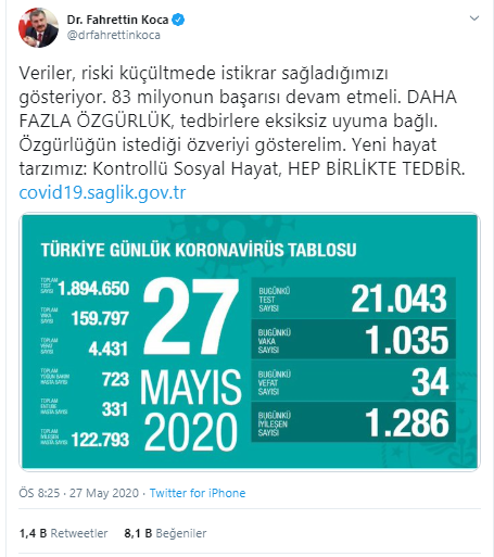 Sağlık Bakanı Fahrettin Koca, Türkiye'de koronavirüsten hayatını kaybedenlerin sayısını açıkladı.Fahrettin Koca'nın yaptığı açıklamaya göre Türkiye'de koronavirüsten hayatını kaybedenlerin sayısı 4 bin 431'e yükseldi.Koca'nın paylaştığı görsele göre toplam vaka sayısı 159 bin 797 oldu.Koronavirüs tablosubu paylaşan Fahrettin Koca, "Veriler, riski küçültmede istikrar sağladığımızı gösteriyor. 83 milyonun başarısı devam etmeli. DAHA FAZLA ÖZGÜRLÜK, tedbirlere eksiksiz uyuma bağlı. Özgürlüğün istediği özveriyi gösterelim. Yeni hayat tarzımız: Kontrollü Sosyal Hayat, HEP BİRLİKTE TEDBİR. " ifadelerini kullandı. AYRINTILAR GELİYOR...