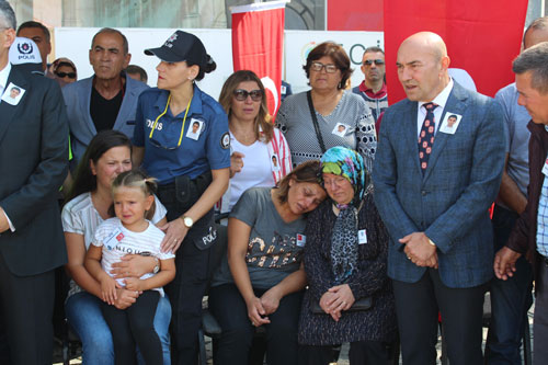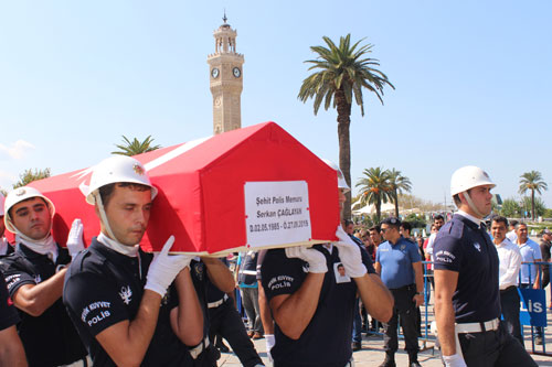 5 yaşındaki kızının "baba" deyişi yürekleri yaktıEvli ve 1 kız çocuk babası olan şehit polis memuru Serkan Çağlayan için Konak Meydanında tören düzenlendi. Şehidin Türk bayrağına sarılı tabutunun tören alanına getirilişi sırasında ailesi ve yakınları gözyaşlarını tutamadı. Şehidin 5 yaşındaki kızı Nehir Çağlayan'ın "baba" diyerek feryat etmesi yürekleri yaktı. Saygı duruşunda bulunulduktan sonra şehidin öz geçmişi okundu ve dua edildi.