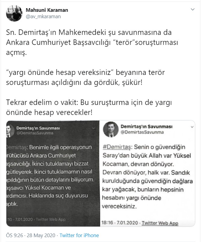 Eski hdp Eş Genel Başkanı Selahattin Demirtaş'a mahkemede savunma yaparken kullandığı ifadeler gerekçe gösterilerek, Ankara Cumhuriyet Başsavcılığı tarafından "terör" soruşturması açıldı.Demirtaş, savunmasında "Benimle ilgili operasyonun yürütücüsü Ankara Cumhuriyet Başsavcılığı. İki tutuklamayı bizzat örgütleyerek. İkinci tutuklamamın nasıl yapıldığının bütün detaylarını biliyorum. Başsavcı Yüksel Kocaman ve yardımcısı. Haklarında suç duyurusu yaptık. Senin o güvendiğin Saray'dan büyük Allah var Yüksel Kocaman. Devran dönüyor, halk var. Sandık kurulduğunda güvendiğin dağlara kar yağacak. Bunların hepsinin hesabını yargı önünde vereceksiniz" diye konuşmuştu.Ankara Cumhuriyet Başsavcılığı bu sözleri "suç" saydı ve Demirtaş hakkında "terör" soruşturması başlattı. Kararı Demirtaş'ın avukatı Mahsuni Karaman sosyal medya hesabından açıkladı.Karaman açıklamasında, "Yargı önünde hesap vereceksiniz beyanına "terör" soruşturması açıldığını da gördük, şükür! Tekrar edelim o vakit bu soruşturma için de yargı önünde hesap verecekler" ifadelerini kullandı.