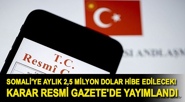 KP Genel Başkanı ve Cumhurbaşkanı Recep Tayyip Erdoğan'ın imzasıyla Resmi Gazete'de yayımlanan kararda, Somali'ye aylık 2,5 milyon dolar olmak üzere ve 30 milyon doları aşmayacak şekilde hibe verileceği belirtildi.Türkiye'nin 'Donör', Somali Federal Cumhuriyeti'nin ise 'Alıcı' olarak tanımlandığı anlaşmada şöyle denildi:1. Donör, iç hukuku ve yıllık bütçe ödenekleri çerçevesinde, alıcıya aylık 2.500.000 ABD doları olmak üzere 30.000.000 ABD dolarını aşmayacak şekilde hibe nitelikli bir finansal katkı sağlayacaktır.2. Alıcı hibeyi bütçe finansmanı ve kurumsal kapasitenin geliştirilmesi amaçları için kullanacaktır. 3. Hibe, alıcının mali kuralları, idari düzenlemeleri ve uygulamalarına uygun olarak denetlenecektir.