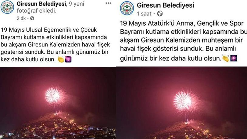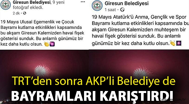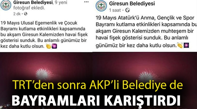 TEPKİLER ÜZERİNE MESAJ SİLİNDİBelediye ait sosyal medyan hesabından yayınlanan kutlama mesajında, “19 Mayıs ulusal egemenlik ve Çocuk bayramı kutlama etkinlikleri kapsamında bu akşam Giresun Kalemizden havai fişek gösterisi sunduk. Bu anlamlı günümüz bir kez daha kutlu olsun” diye yazıldı.Gelen tepkiler üzerine kısa sürede hatasını anlayan görevliler mesajı değiştirerek, “Ulusal Egemenlik ve Çocuk Bayramı” yerine “19 Mayıs Atatürk’ü Anma, Gençlik ve Spor Bayramı” diye yazdı.“SARAYIN KAYIĞINDA OLANLARDAN HAYIR GELMEZ”Belediye tarafından yapılan yanlışlığa sosyal medya hesabından tepki gösteren CHP Giresun Milletvekili Necati Tığlı ise, şunları kaydetti:* TRT’den sonra bir diğer skandal Giresun Belediyesinden geldi. Giresun Belediyesi de ’19 Mayıs Ulusal Egemenlik ve Çocuk Bayramı’ diye kutlama yapıyor. Bu artık sadece cehaletle açıklanamaz.* Kimin hangi gemide olduğu da belli oluyor. Biz Bandırma Vapuru’ndayız. Sarayın saltanat kayığında olanlardan bu ülkeye hayır gelmez.TRT DE BAYRAMLARI KARIŞTIRDITürkiye Radyo Televizyon Kurumu (TRT), dün yayınlanan haber bülteninde 19 Mayıs için “Cumhuriyet Bayramı kutlu olsun” ifadesini içeren görsel yayınladı. Hatanın anlaşılması üzerine görsel kısa sürede değiştirildi. Sorumlu personel hakkında idari soruşturma başlattığını duyuran kurum bir de özür mesajı yayınladı.