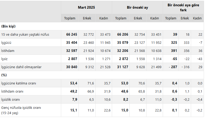 İstihdam edilenlerin sayısı 2025 yılı Mart ayında bir önceki aya göre 391 bin kişi artarak 32 milyon 597 bin kişi, istihdam oranı ise 0,6 puan artarak yüzde 49,2 oldu. Bu oran erkeklerde yüzde 66,9 iken kadınlarda yüzde 31,9 olarak gerçekleşti.İşgücü 2025 yılı Mart ayında bir önceki aya göre 325 bin kişi artarak 35 milyon 404 bin kişi, işgücüne katılma oranı ise 0,4 puan artarak yüzde 53,4 olarak gerçekleşti. İşgücüne katılma oranı erkeklerde yüzde 71,6 iken kadınlarda yüzde 35,7 oldu.GENÇ NÜFUSTA İŞSİZLİK YÜZDE 15,1