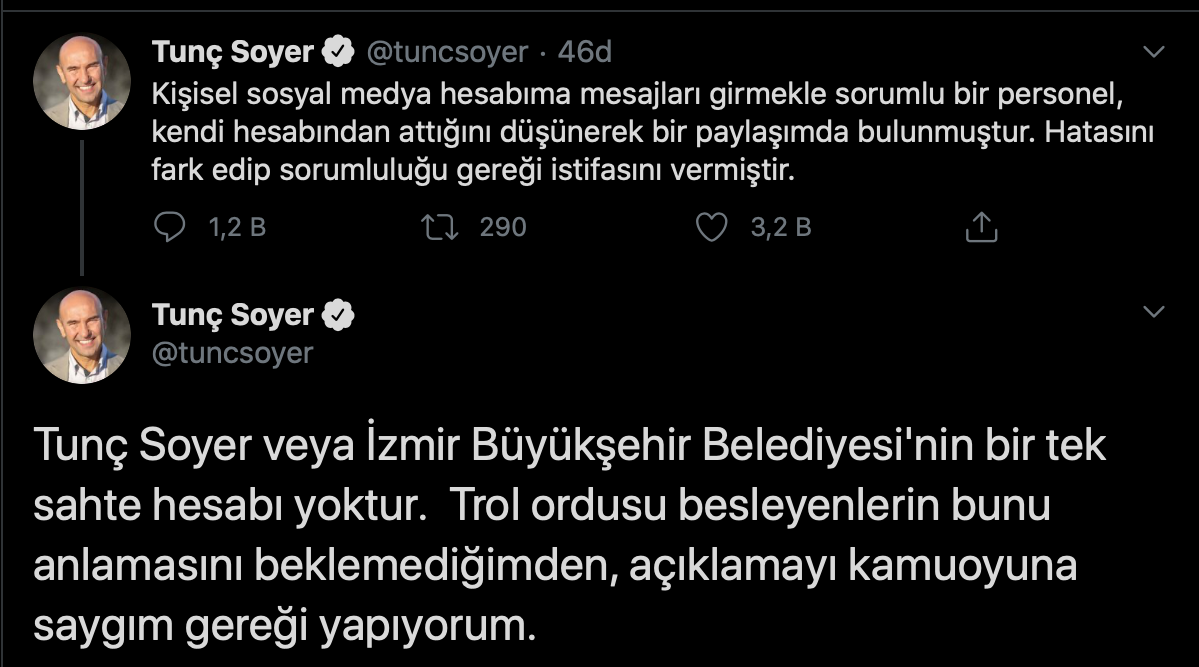 Sorumlu danışmanın yaptığı hata nedeniyle istifasını verdiğini belirten Tunç Soyer, konuya ilişkin, ”Kişisel sosyal medya hesabıma mesajları girmekle sorumlu bir personel, kendi hesabından attığını düşünerek bir paylaşımda bulunmuştur. Hatasını fark edip sorumluluğu gereği istifasını vermiştir” açıklamasında bulundu.Trol ordusunu besleyen unsurlara da bir mesaj veren Soyer, ”Tunç Soyer veya İzmir Büyükşehir Belediyesi'nin bir tek sahte hesabı yoktur. Trol ordusu besleyenlerin bunu anlamasını beklemediğimden, açıklamayı kamuoyuna saygım gereği yapıyorum.” dedi.