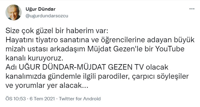Dündar, Twitter hesabından yaptığı paylaşımda, “Size çok güzel bir haberim var: Hayatını tiyatro sanatına ve öğrencilerine adayan büyük mizah ustası arkadaşım Müjdat Gezen'le bir YouTube kanalı kuruyoruz. Adı UĞUR DÜNDAR-MÜJDAT GEZEN TV olacak kanalımızda gündemle ilgili parodiler, çarpıcı söyleşiler ve yorumlar yer alacak" ifadelerini kullandı.