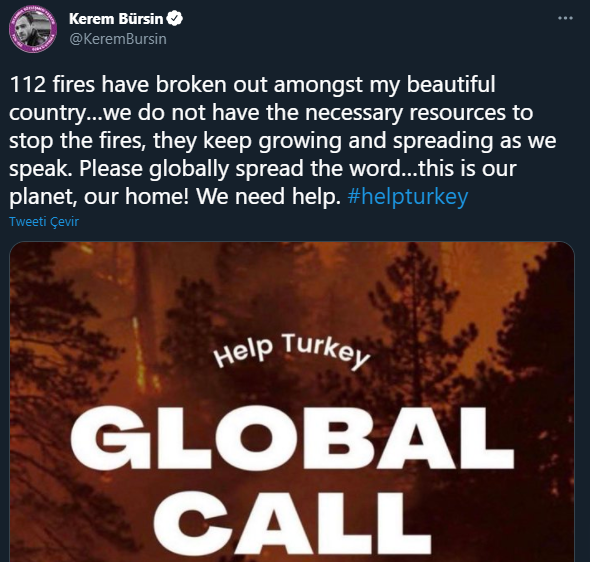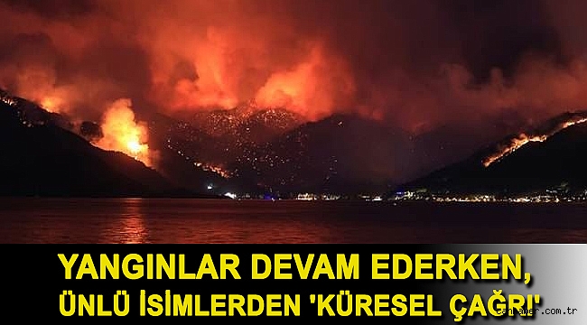 Ünlü sanatçıların destek verdiği kampanyada, "Güzel turkuaz kıyılarımız ve dağlarımızın 60'dan fazla bölgesinde çıkan orman yangınlarını durdurmak için yangın söndürme uçaklarına ve desteğe ihtiyacımız var" ifadelerinin yer aldığı bir görsel paylaşıldı.
