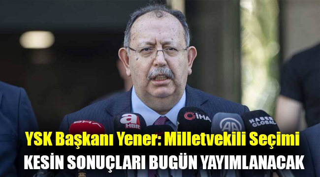 Yüksek seçim Kurulu (YSK) Başkanı Ahmet Yener, 14 Mayıs'ta yapılan 28. Dönem milletvekili Genel Seçimi kesin sonuçlarının bugün Resmi Gazete'ye gönderileceğini bildirdi.YSK Başkanlık binasına girişi sırasında bir gazetecinin sorusunu cevaplayan Yener, 28. Dönem Milletvekili Genel Seçimi kesin sonuçlarının bugün açıklanmak üzere Resmi Gazete'ye gönderileceğini söyledi.YSK takvimine göre, itiraz süreçlerinin sona ermesinin ardından Cumhurbaşkanı Seçimi'nin kesin sonuçlarının da 1 Haziran'da ilan edilmesi bekleniyor. Kesin olmayan sonuçlara göre 13. Cumhurbaşkanı seçilen Recep Tayyip Erdoğan'ın sonuçların yayımlanmasının ardından 2 Haziran Cuma günü yeni Kabine'yi açıklaması bekleniyor.