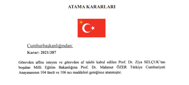 Ankara kulislerinde bir süredir Ziya Selçuk'un 'yetkisizliik'ten yakındığı ve bazı tarikat ve cemaatlerin bakanlıktaki faaliyetlerinden rahatsız olduğu konuşuluyordu. Prof. Dr. Ziya Selçuk Milli Eğitim Bakanlığı'ndan istifa etti, yerine Prof. Dr. Mahmut Özer'in atandı. Cumhurbaşkanı ve AKP Genel Başkanı Tayyip Erdoğan, Milli Eğitim Bakanlığı'na üç bakan yardımcısı ataması yaptı."GÖREVDEN AFFINI İSTEDİ"Erdoğan imzasıyla Resmi Gazete'de yayımlanan kararda, Ziya Selçuk'un 'görevden af talebinin kabul edildiği' bildirilirken, Milli Eğitim Bakanlığı'na Bakan Yardımcısı Mahmut Özer'in atandığı açıklandı. Kararda, "Görevden affını isteyen ve görevden af talebi kabul edilen Prof. Dr. Ziya Selçuk'tan boşalan Milli Eğitim Bakanlığına Prof. Dr. Mahmut Özer Türkiye Cumhuriyeti Anayasasının 104 üncü ve 106 ncı maddeleri gereğince atanmıştır" denildi.